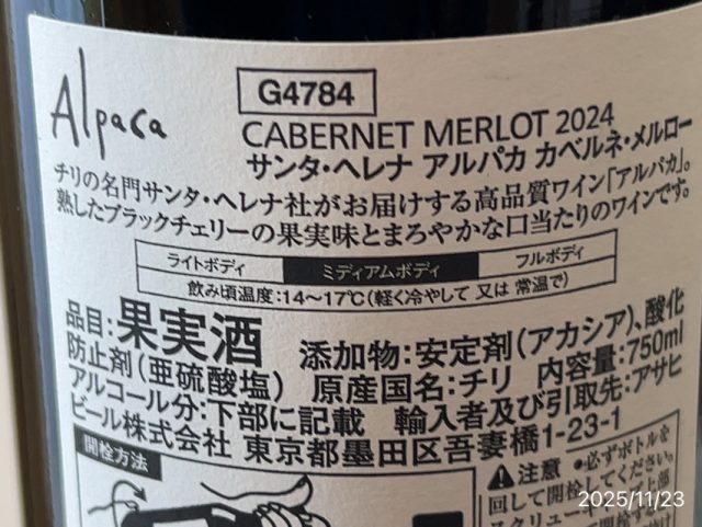 Alpaca (アルパカ)カベルネ・ソーヴィニョン メルローです。