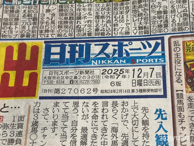 関西地方のスポー新聞は1面は阪神ネタが多いのですが、この日は競馬でした。