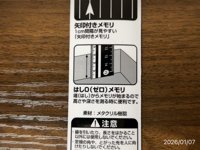 定規の端っこからスタートして寸法が記載されているので、高さや深さを測るのに便利とのことです。