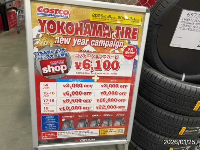 コストコさんでヨコハマタイヤを買うと、コストコで買い物をするときに使えるショップカードがもらえるキャンペーンが2026年2月1日まで実施されています。